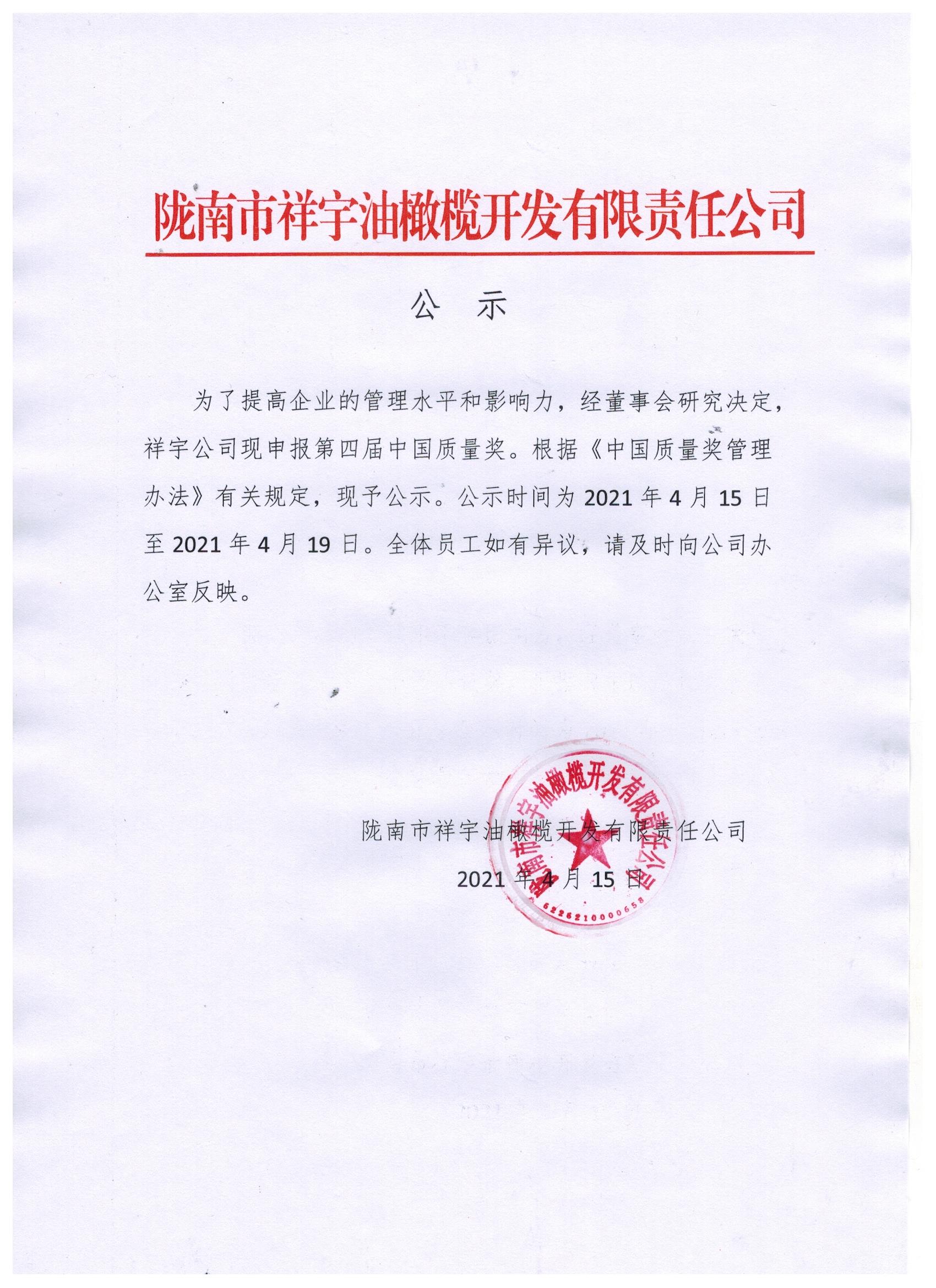 隴南市祥宇油橄欖開發(fā)有限責(zé)任公司關(guān)于申報(bào)第四屆中國(guó)質(zhì)量獎(jiǎng)的公示